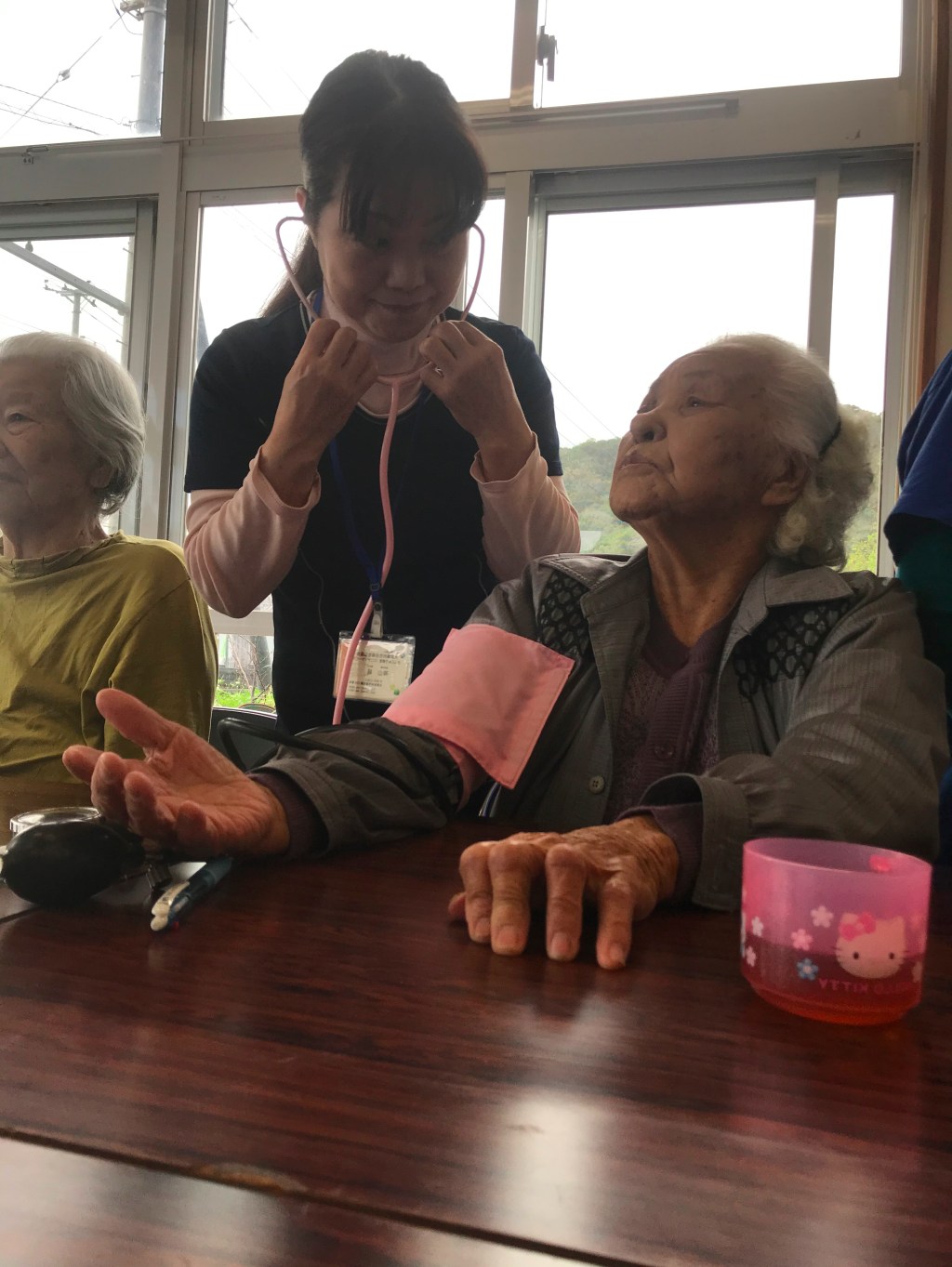 Ich verstehe nicht, was sie meint, zum Glück kommt jetzt eine Krankenschwester an unseren Tisch und legt Hana die Manschette eines Blutdruckgeräts an, während die anderen zum Tanz übergehen, Frauen wie Mizako (90), Sara (99) und Nozomi (103). Die Musikanlage spielt okinawanische Folklore. Wer keine Kraft zum Stehen kann, hebt im Sitzen die Arme so weit es geht in die Höhe, schraubt die Hände in die Luft. Eine der Frauen löst sich aus dem Kreis, sie hat ihre Fäuste in die Taille gestemmt, nähert sich mir und fordert mich mit wiegenden Hüften zum Tanz auf.