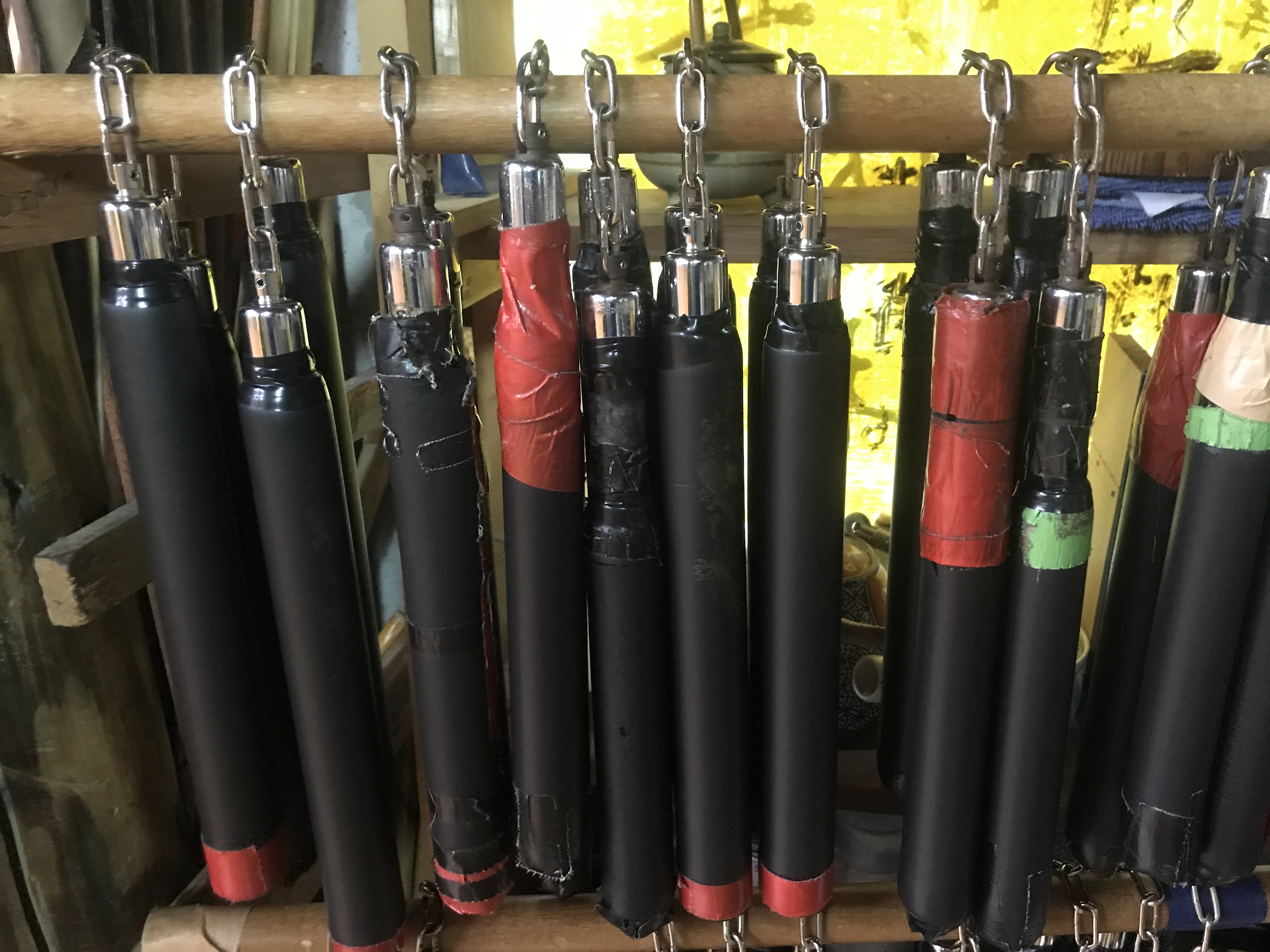 Von links oben nach rechts unten: Tetsuhiro Hokama (10. Dan, Gōjū–Ryū-Karate) während des Fotoshootings; Gruppenbild mit Trainingspartner Dejan (rechts neben Hokama-Sensei) und Reporter Avantario (links neben Hokama); zerlegter und geflickter Dummy; Nunchacks (dt. Würgehölzer); Preisliste für das Dojotraining. Fotos: Vito Avantario|Good Storys Hamburg